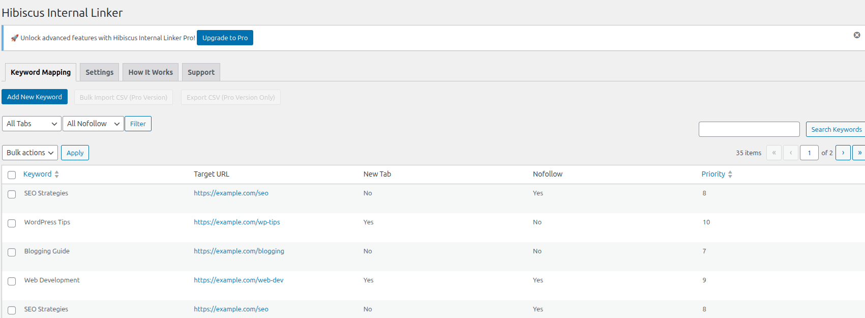 Define keywords and target URLs — the plugin will auto-link them across your posts and pages. - Keyword Mapping Interface