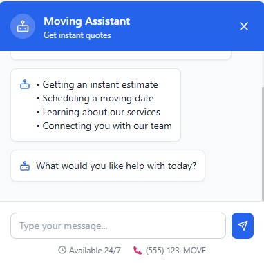 ✅ Conversational Lead Capture – Replace boring contact forms with engaging chat-style interactions that encourage visitors to share their moving needs.
